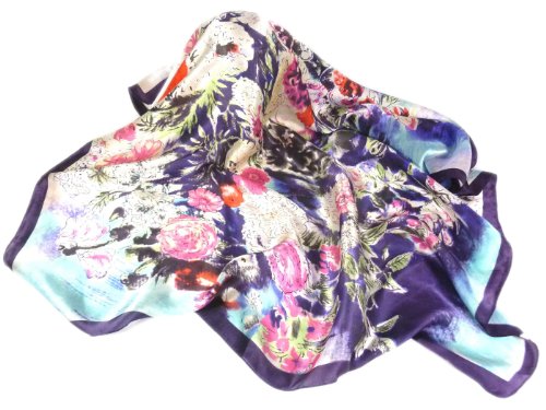 Écharpe en 100% Soie, avec des fleurs motif en violet et rose - 90cm carrés