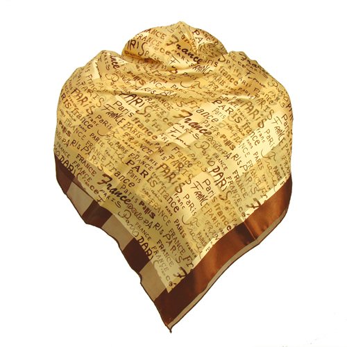 Foulard Femme léger et soyeux, en cadeau ou en souvenir de Paris. Dessin : Inscriptions Paris et France en calligraphie fine. Matière : Façon mousseline et satin (100% polyester). Coloris : Beige et marron. Taille : 90cm x 90cm.